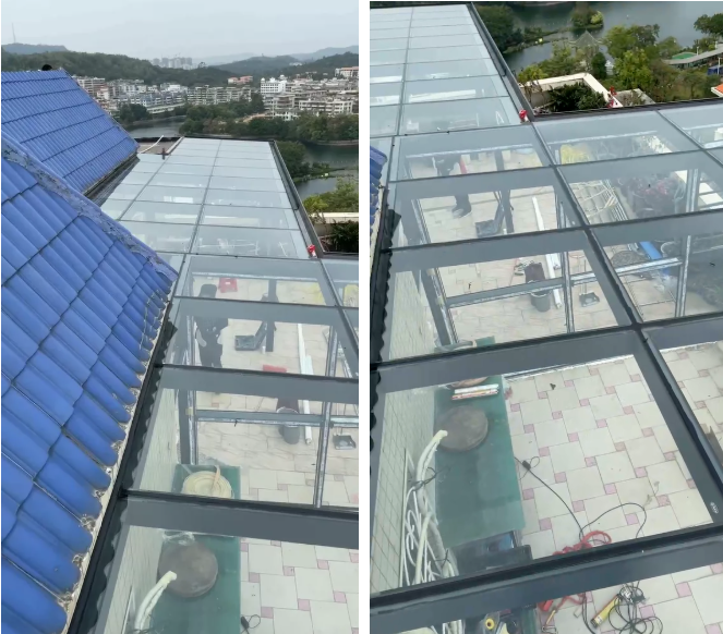 房頂上鋪夾膠玻璃,具有超強的抗沖擊力,防止冰雹、重物撞碎玻璃。玻璃與型材間打上多道密封膠,防止雨水滲漏。